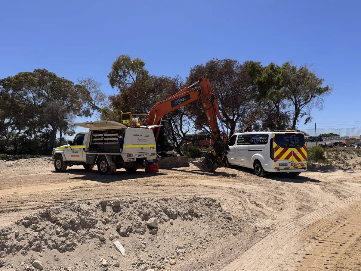 Machinery: 2 mini dump trucks, backhoe, roller compactor
